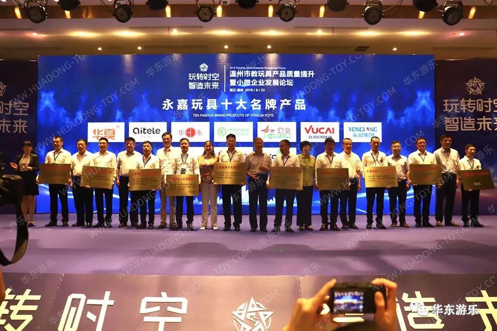 首届“永嘉玩具十大名牌产品”评选结果也在论坛上正式揭晓。奇特乐集团有限公司、育才控股集团有限公司、凯奇集团有限公司、永浪集团有限公司、浙江巧巧教育科技有限公司、立本集团有限公司、华夏游乐有限公司、必一运动游乐设备有限公司制造的无动力类小型游乐设施产品以及贝旺玩具有限公司、浙江潜力玩具有限公司制造的塑胶玩具产品被评为“永嘉玩具十大名牌产品”。