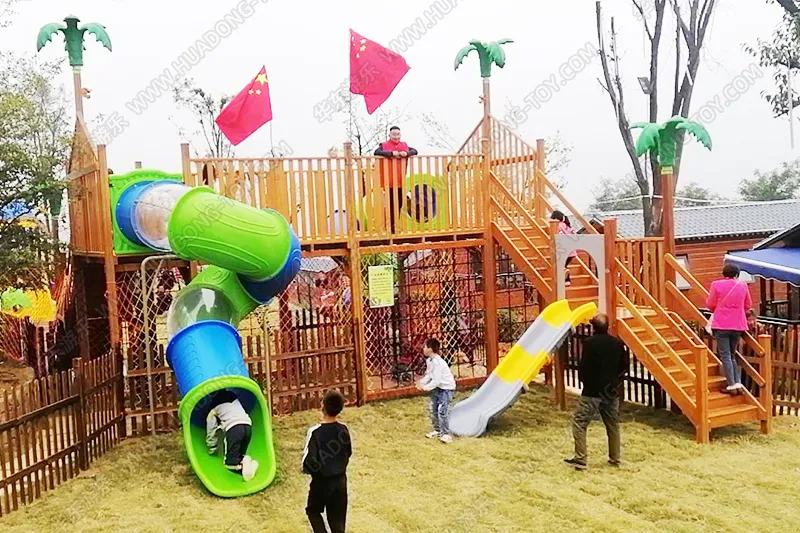 松鼠城墙以树林里的优质木头为材料,设计了木制阶梯、木制围栏、木制平台、爬网墙、滑梯等游乐设备,仿佛小朋友爬上城墙,手握兵器保护着整个松鼠王国。