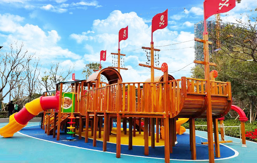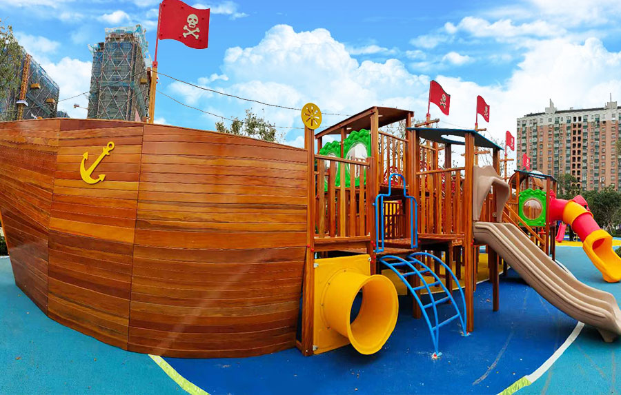 非标木制滑梯组合案例采用海盗船的设计主体为原型设计,增加了大型滑梯组合以及攀爬、钻洞等功能,整个主体设备采用木制结构,必一运动游乐生产的木制游乐设备具有颜色艳丽、外观漂亮,实用性强、经久耐用、安全性能好等特点,为小朋友的玩耍提供了一个很好的场所。