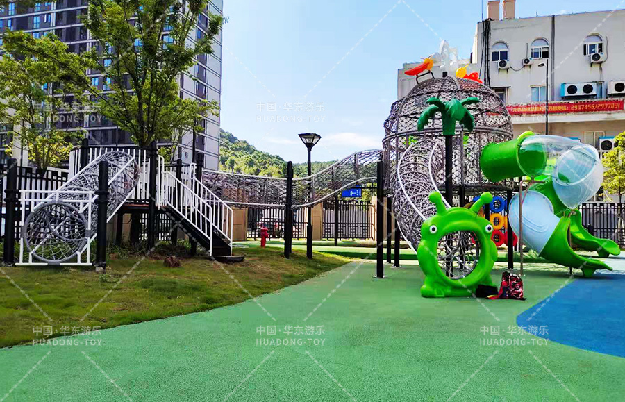 舟山市畚斗岙幼儿园此次选用的是又必一运动游乐自主研发和设计的网绳系列户外滑梯组合,具备了爬网、钻洞、滑梯、滑桶、吊环、攀爬梯、沙池等游乐设备,能够让小朋友在玩耍中得到很好的锻炼和学习。
