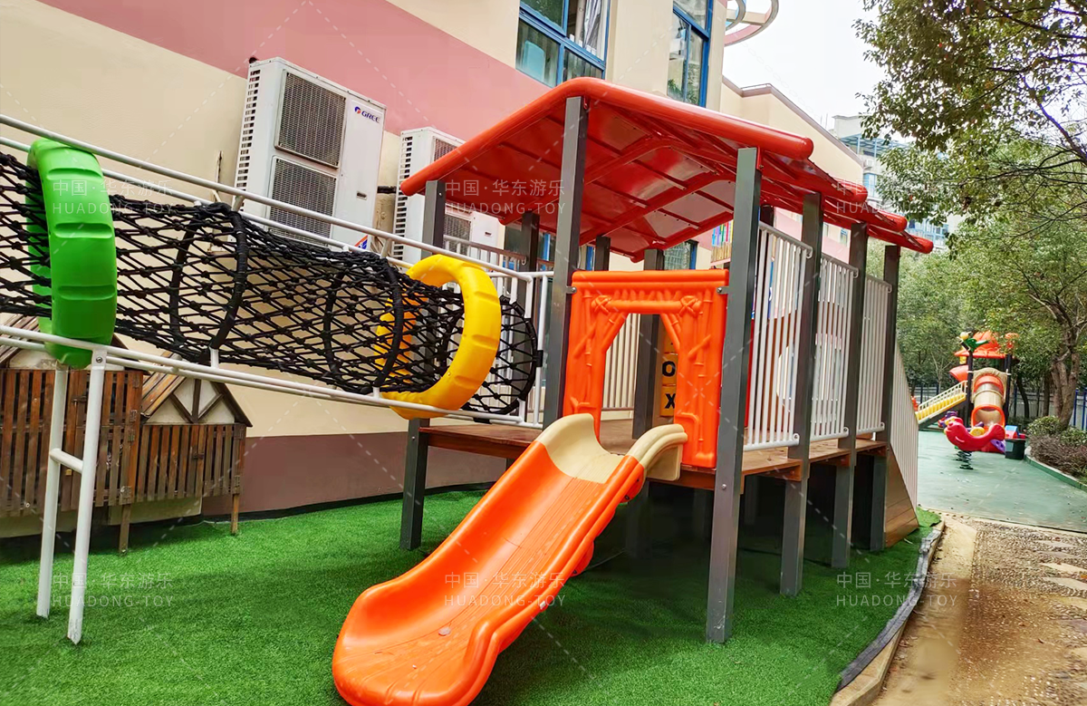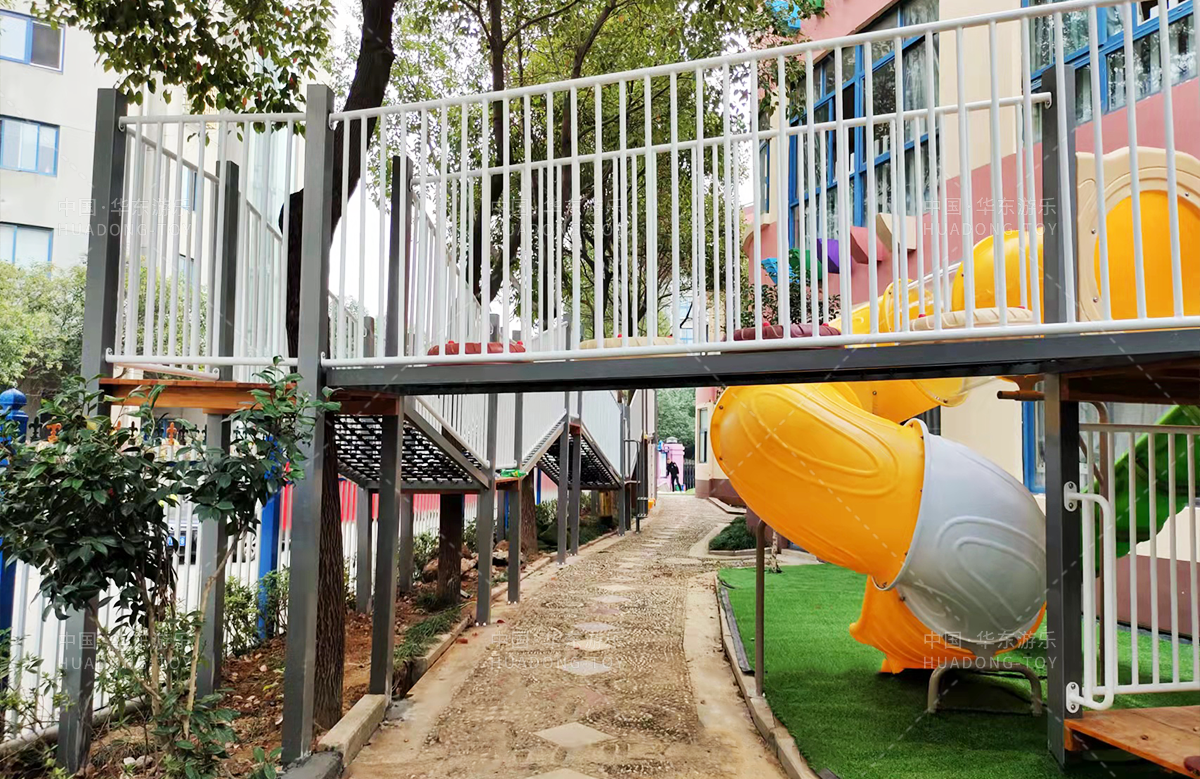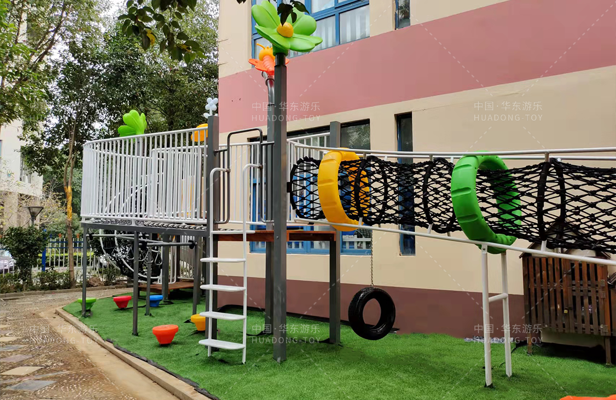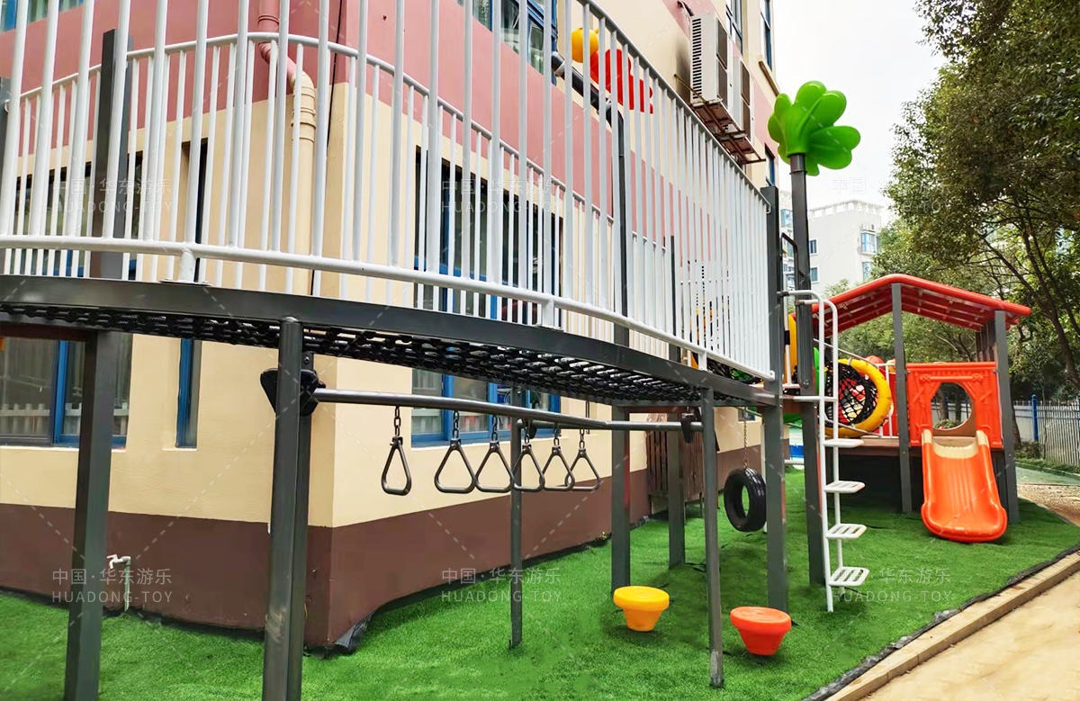 绿都幼儿园选用的是必一运动游乐自主研发的具有攀爬、滑梯、爬网、钻洞、葫芦攀爬为一体的综合性游乐设备。
