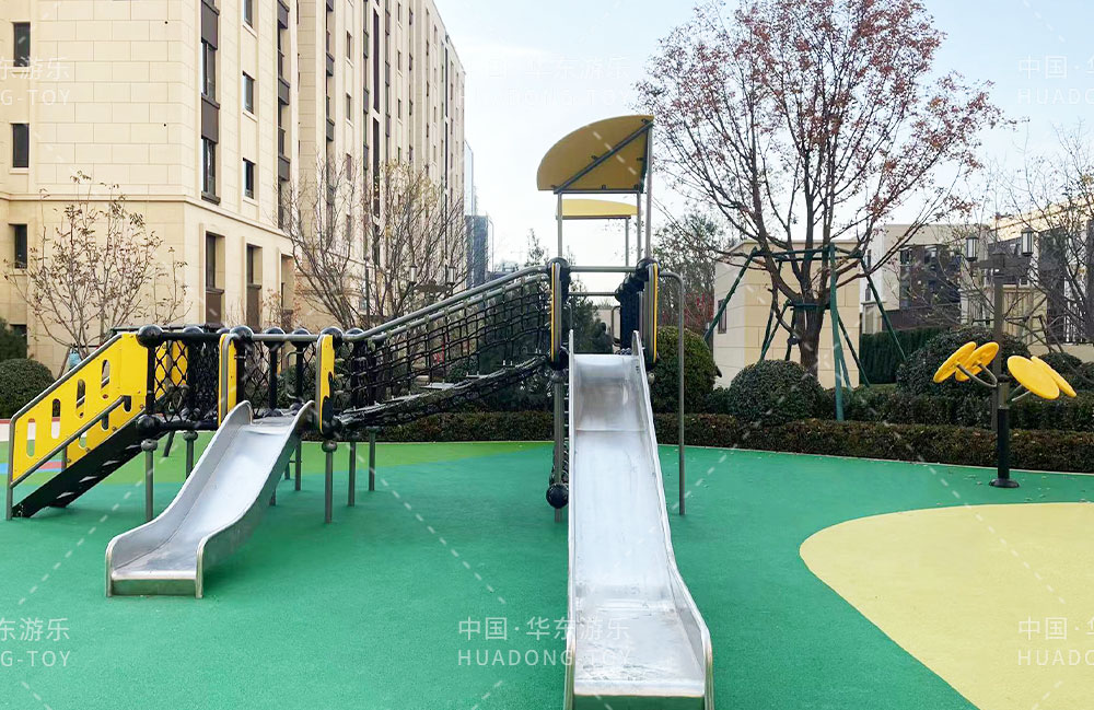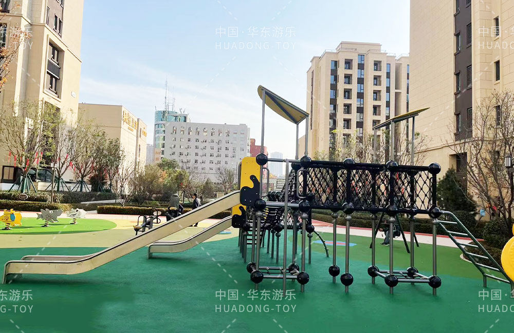太原华润昆仑域地产项目选用的是必一运动游乐自主研发的游乐设备,娱乐场里选用了健身器材、具备攀爬网、不锈钢滑梯为一体的综合性游乐设备,为生活在该小区的人们提供了一个生活、休闲、娱乐的场所。