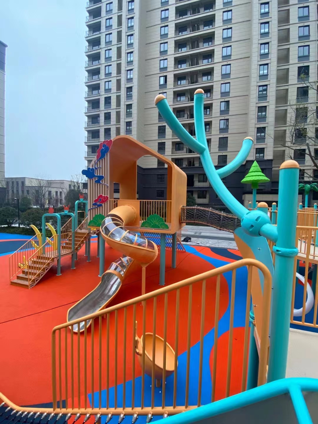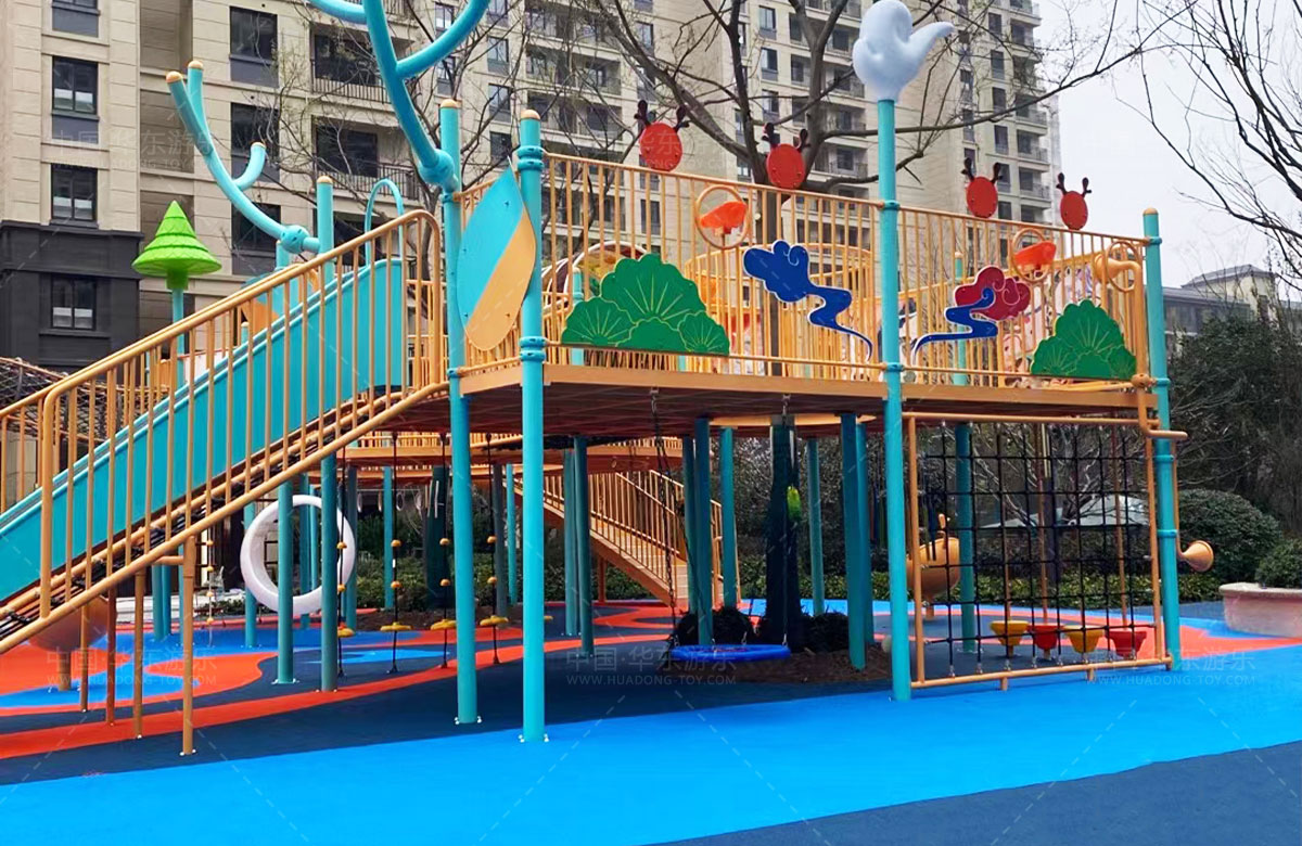 建投东方名府源著儿童游乐项目是必一运动游乐生产的非标定制的主题性游乐设备,整个项目采用以森林麋鹿为设计主题,分别设计了攀爬网、钻洞、不锈钢滑梯、旋转椅、传声筒、秋千、脚踏平衡杆、攀爬梯等功能,为小朋友的健康成长提供了一个很好的游玩场所。