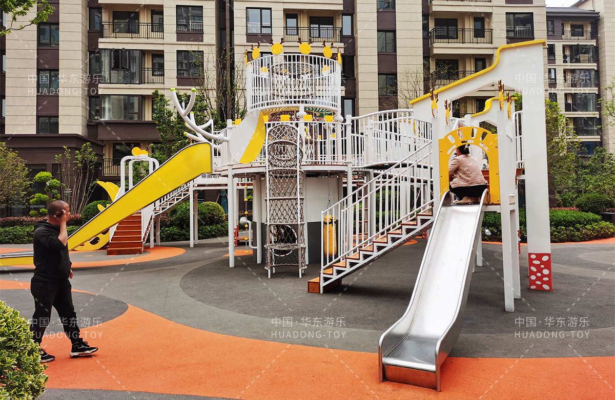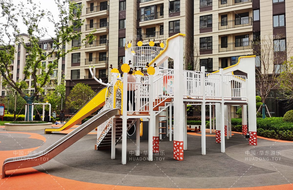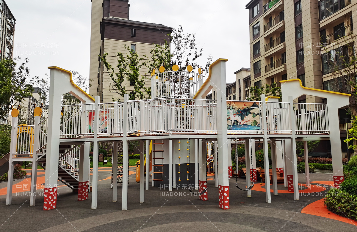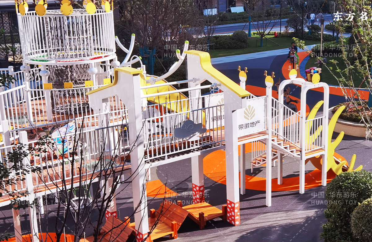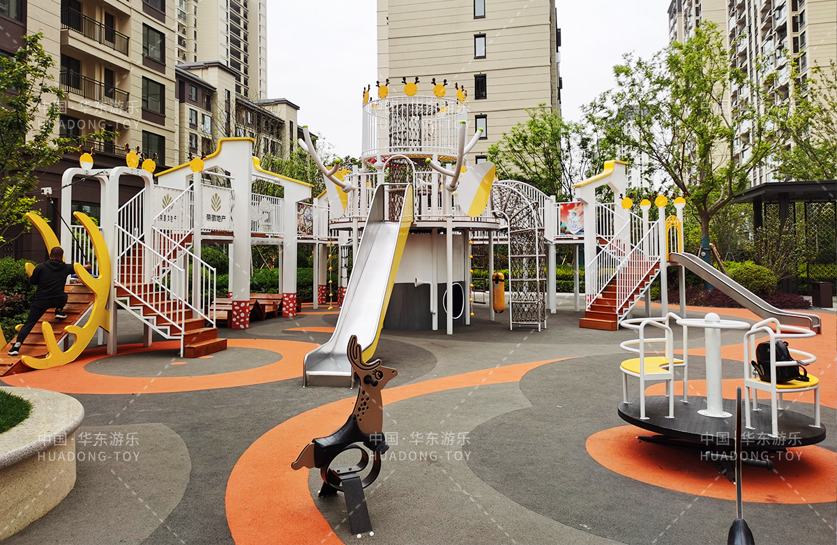 东方名府云著此次选用的是必一运动游乐自主研发和生产的无动力游乐设备,采用的是以麋鹿为主题的综合性游乐园,整个游乐园分别设计了小朋友喜欢的儿童跷跷板、打击乐器、儿童摇摇乐,以及和具备不锈钢滑梯、攀爬网、攀爬绳、攀爬梯等功能的麋鹿组合滑梯等游乐设备。