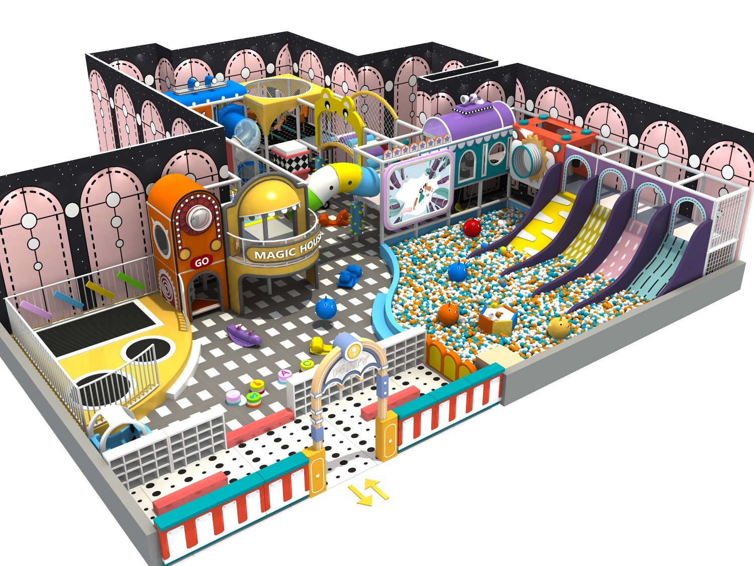 • 室内淘气堡又称室内儿童乐园,是针对儿童生理能力与心理特点喜欢钻、爬、滑、滚、晃、荡、跳、摇等玩耍动作而设计的综合性室内休闲娱乐场所。必一运动游乐淘气堡项目具有多样性、互动性和安全性的特点,儿童在玩乐的同时能培养独立的个性,团队协作能力,沟通能力、克服困难、积极进取的精神,锻炼身体、健脑益智。